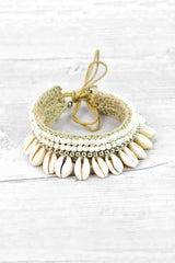 A handmade anklet feature tiny wooden beads and ethically sourced cowrie shells.